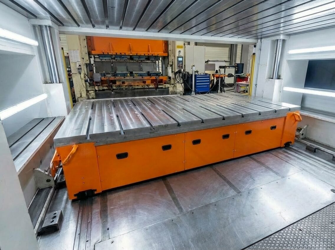In high-stakes production environments like defense manufacturing, speed and safety during die changes are critical. PRESTON Mobile Die Tables (also known as Die Change Carts) are engineered to handle multi-ton molds with extreme stability.