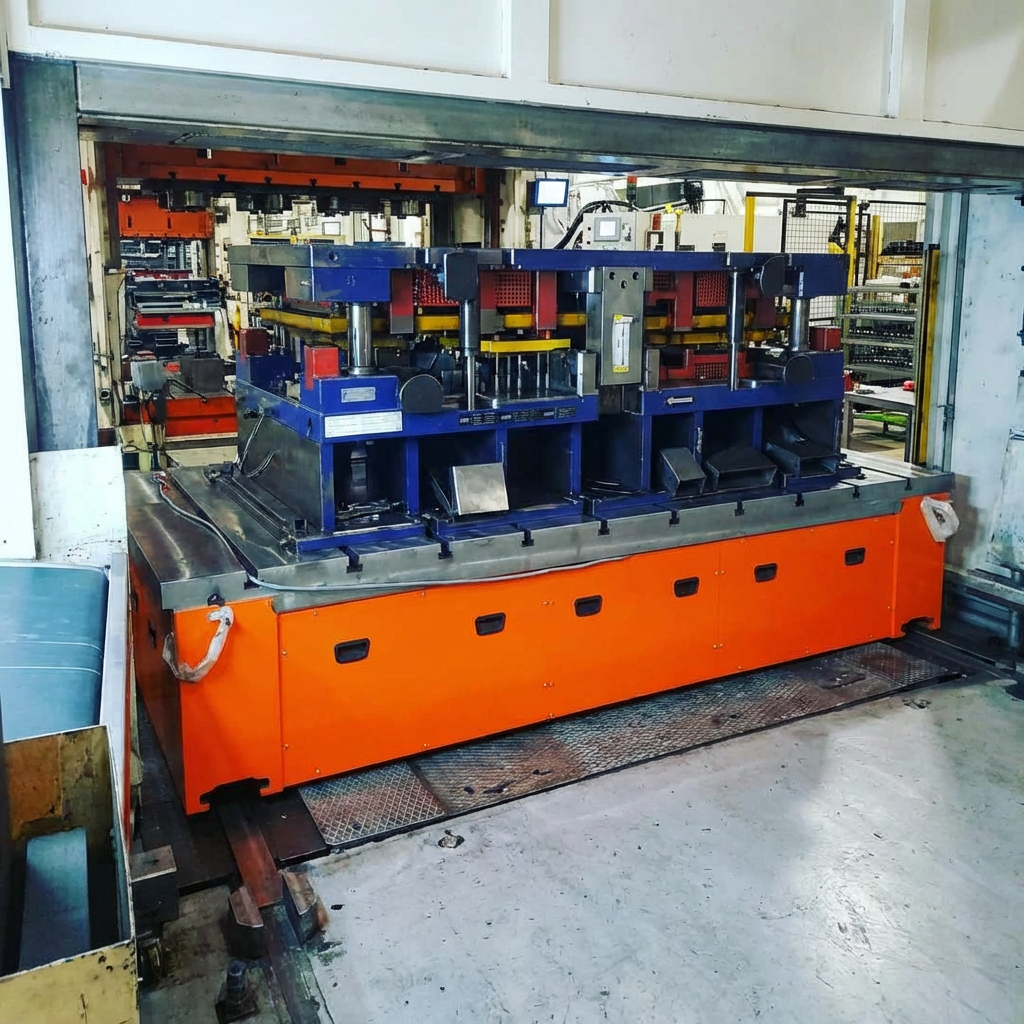 The second mobile tables operate on the opposite side of the first. While the original table is inside, you perform mold changes on the spare one. We do not change the existing locking and lifting systems inside the press; we use them as they are.