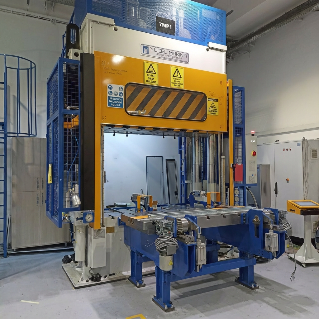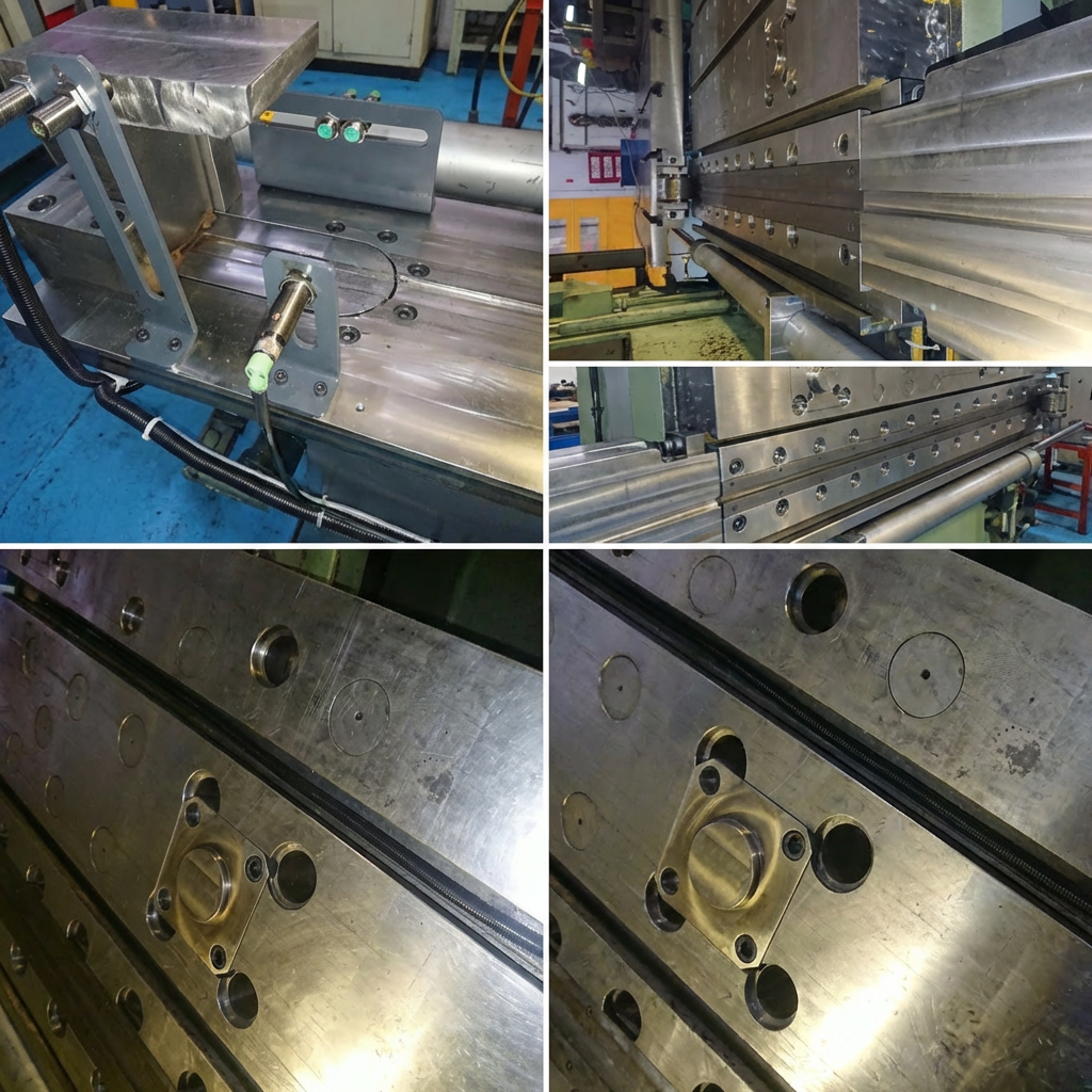 If this is not possible, it will move on rails laid on the ground with two wheeled feet at the front. Before exiting, it will rise slightly and return to its center slots. If you are using a drawing or forming die, it will lock in place.
